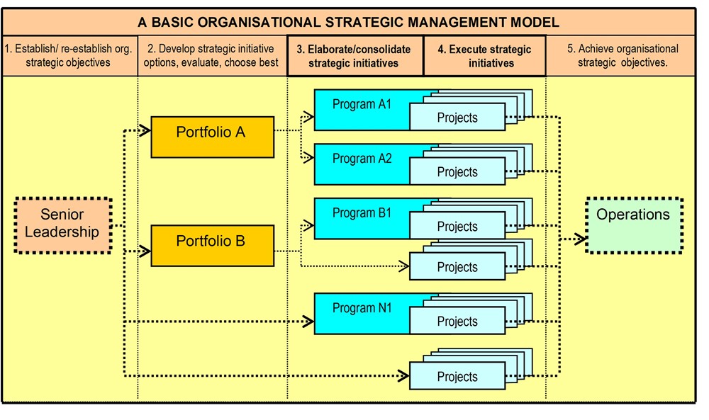 We start by expanding Figure 2-1 to show various possible combinations of portfolios, programs and projects in the context of the organisational strategic management model.