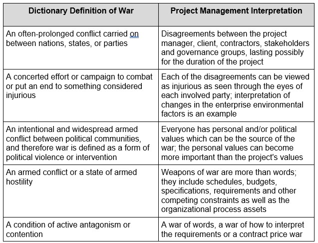 We begin our projects with the greatest of intentions. Some people view project management as a series of contests or challenges beginning with a well thought out plan that everyone agrees with. When projects do not necessarily go according to plan, we may end up with rigorous confrontations that can lead to skirmishes and even battles with stakeholders and other personnel. Some battles on projects are so intense that we consider them as all out wars.