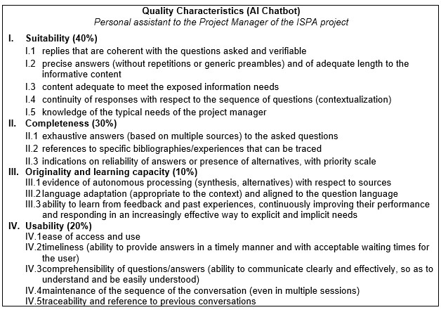 - any answer was evaluated using the same already applied quality model (Table 1), by assigning a rating to every sub-characteristic on a 0-3 scale (in ascending order): threshold level was set at 2 (partially satisfactory);