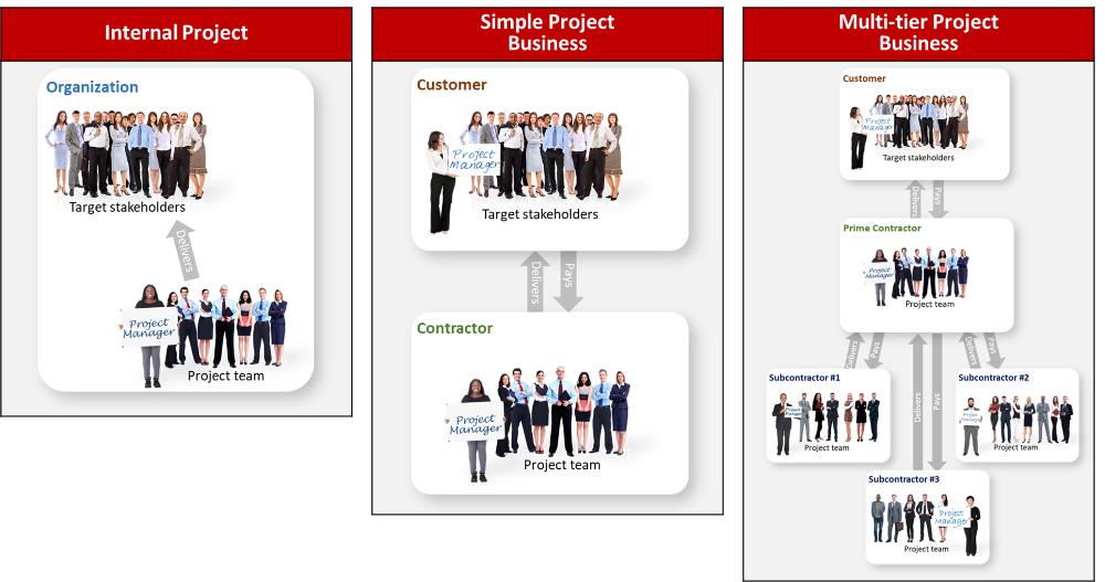 Figure 1: In contrast to internal projects, where the target stakeholders of the project and its performing team are located in the same organization, Project Business is cross-corporate with two or more—often many more—organizations involved.