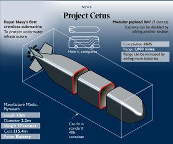 Defence Projects. We have previously reported on pilotless sub-sea vessels, particularly those used for exploration and environmental research. Now comes news of another use as a new project for the Royal Navy has been approved. Project Cetus is a £15.4 million project; the Cetus is named after the mythological sea monster that was slain by Perseus. It consists of a pilotless battery-powered drone able to cover up to 1,000 miles in a single mission. It joins the Navy’s crewless mine-hunting capabilities and driverless Pacific 24 sea boats which are currently undergoing sea trials.