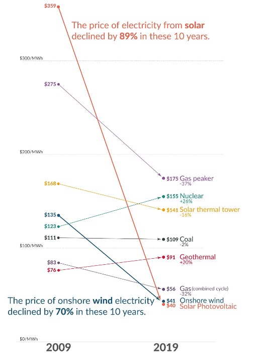 The price of electricity from the solar and wind power has declined enormously during the last ten years. Today both solar and wind energy provide the lowest cost of electricity. And both of those energy forms are limitless. Lower cost of energy provides a higher living standard. So far, our high living standard has been based on fossil fuels: coal, oil and natural gas. But in the future, this will be done by the solar and wind energy and the new battery technology.