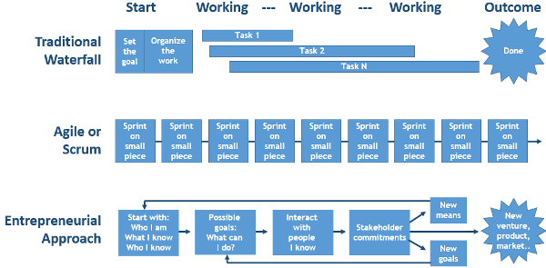 Useful tools help capture relevant information, enable managers to strategize and facilitate a plan that fits project target, context and surrounding conditions. Thereby, tools differ in various aspects. Projects that have a fixed goal or objective use tools to sequence the steps and follow the most efficient linear, or causal logic (please see Figure 1; Traditional Waterfall). In situations of greater ambiguity, breaking a big project down into smaller “sprints” enables manageable work increments and allows for project objectives to evolve after the project has begun, by implementing agile or dynamic cycles (please see Figure 1; Agile or Scrum). But entrepreneurs face a far more open-ended problem. In addition to managing a different project for each function in the organization, it is unclear at the outset what the startup will end up doing. Certainly the objective is to create a viable venture, but that is a very broad goal. More than 90% of new ventures end up doing something different than the idea they started with (Reynolds, Carter, Gartner, & Greene 2004), so the notion entrepreneurs write a business plan and execute it in a systematic and organized fashion is naïve. Instead, the entrepreneurial approach to a project starts with the resources readily available at hand, explicitly incorporates feedback loops into the process, and functions atop elements within the control of the entrepreneur (Sarasvathy & Dew 2005). A stylized representation of the entrepreneurial approach is contrasted with the traditional and agile approaches to project management in the diagrams in Figure 1.