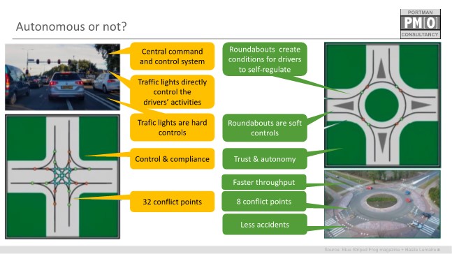 But why are autonomous teams more agile than dependent teams? To illustrate this proposition and to clarify the concepts of ‘autonomous’ and ‘dependent’, you can make a comparison with an intersection versus a roundabout. The intersection is a metaphor for dependent teams. And a roundabout is the metaphor for autonomous teams. In the table below you will find important differences in characteristics.