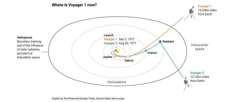 The graphic, from The Times, shows the progress and highlights of the Voyager probes. The fault that struck in November was traced to a chip in the flight data subsystem (FDS). The FDS is responsible for packaging the science and engineering data before it’s sent to Earth. Mission controllers could tell the spacecraft was still receiving their commands and otherwise operating normally. The hardware fault was unrepairable, so NASA’s engineers devised a workaround to place the affected code elsewhere in the FDS memory no single location is large enough to hold the section of code in its entirety. They also needed to adjust those code sections to ensure, for example, that they all still function as a whole. Any references to the location of that code in other parts of the FDS memory needed to be updated as well. Voyager 1’s three computers were top of the range when Voyager was launched in 1977, but have about as much memory as a modern car key fob. “While Voyager 1 is back to conducting science, additional minor work is needed,” Nasa’s Jet Propulsion Laboratory said in a statement. Sadly, as its supply of nuclear fuel runs down, further glitches are expected.