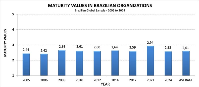 Our maturity research [1] has been ongoing for 20 years and during this time we have monitored the results of hundreds of organizations. If time alone was enough to ensure maturity progression, we should see significant changes in Brazilian organizations towards greater maturity and better performance. The results of the maturity research in Brazil, however, do not show that. As documented on our website [1], Figure 1 shows that the average value for maturity in Brazil, since 2005, is around 2.61, with stability of the values through time, and only small oscillations noted.