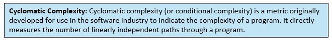 Cyclomatic complexity is a metric used to assess the complexity of a program. It quantifies the number of decision points within the code and number of linearly independent paths. It reflects how intricate your program’s control flow is. More paths mean higher complexity. Several well-established methodologies exist for calculating cyclomatic complexity and its use over the years has resulted in identifying strategies for reducing program complexity. These strategies provide analogs to evaluate in the context of large complex projects.