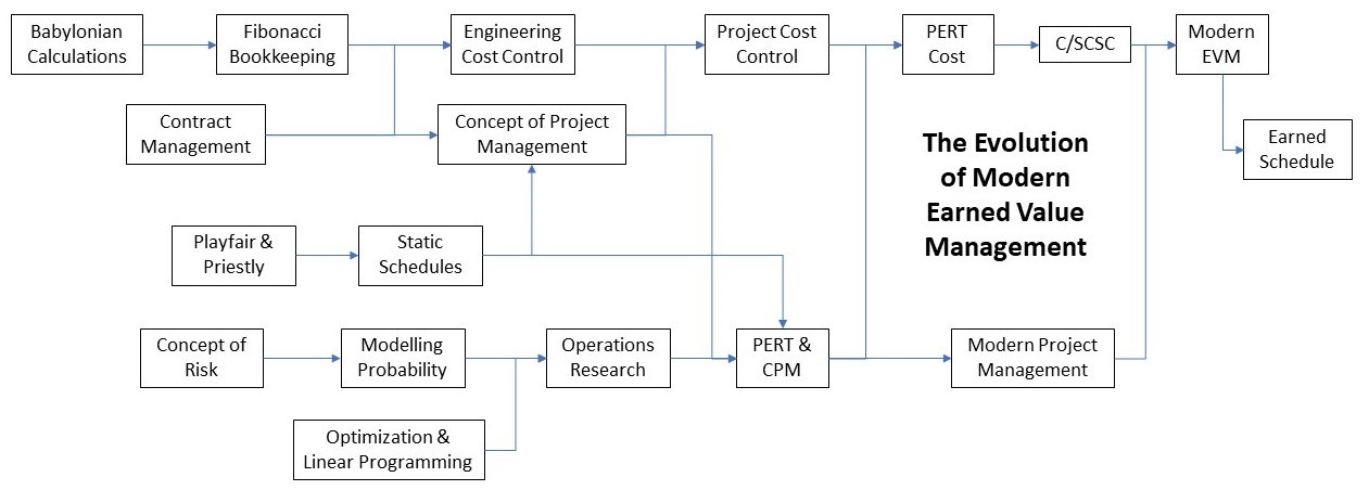 OR uses the mathematics of optimization and linear programming, applied to a scenario, to assess expected future outcomes. These concepts underpinned the systems used by the British Airforce in the ‘Battle of Britain’ and then went on to be applied on both sides of the Atlantic, in a wide range of situations where a range of outcomes was possible. OR was the foundation of critical path and PERT scheduling and the combination of PERT with project cost management (a concept that goes back to the 14th century at least) gave rise to PERT Cost, which in turn evolved in the C/SCSC and then into what we know today as ‘Earned Value’. The overall flow of developments looking something like this: