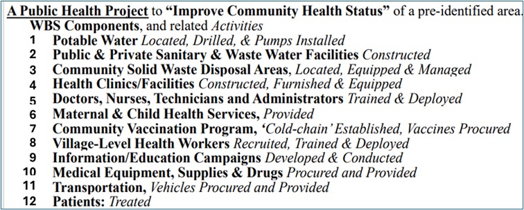 I was very interested in Dr Kenneth Smith’s “musings” on work breakdown structures and the value or otherwise of assigning weights, with examples from programs/projects with which he had been associated. I have chosen to analyse his first example (the Public Health Project) in more detail as a basis for justifying my insistence on assigning meaningful weights to milestones. For ease of reference, I have numbered the WBS components in Dr Smith’s first example, as shown in Figure 1.