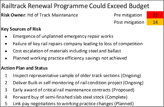 This example is based on a slide format that I have found to be effective in the context of senior or exec management risk review. Note the linkage between risk sources and actions.