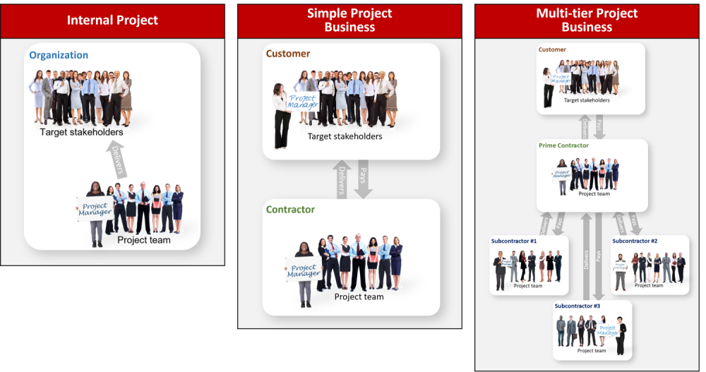Figure 1: In contrast to internal projects, where the target stakeholders of the project and its performing team are located in the same organization, Project Business is cross-corporate with two or more—often many more—organizations involved.