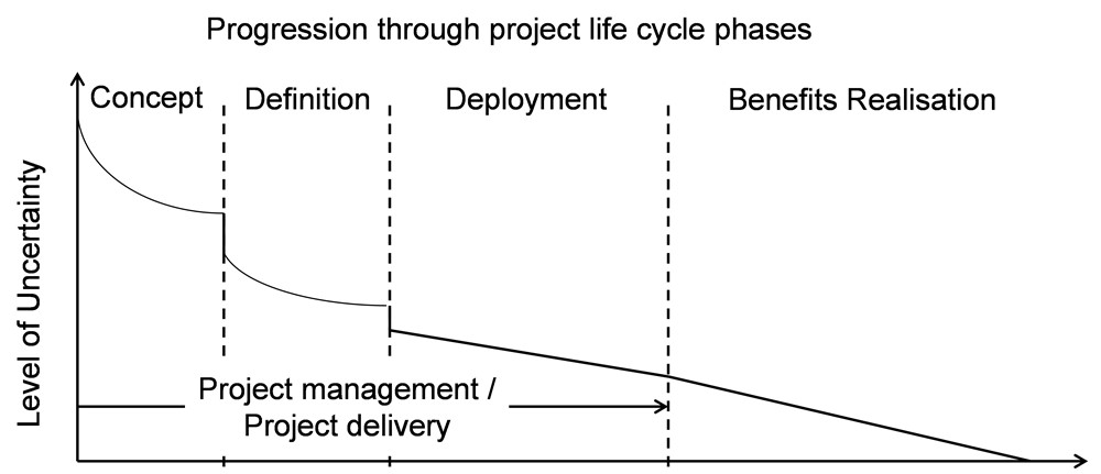 Risk can be understood as being caused by the implications of uncertainty. Usually, the overall level of uncertainly reduces as the project progress and is thus at its greatest at the outset. The figure below is based on a simplified project life cycle model and illustrates how the overall level of uncertainty associated with a project might evolve. Points to note include: