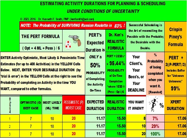 First, to calculate ‘realistic times’ — or any other activity range of times with related probabilities — I developed the template in Figure 1 – on the following page — using an Estimated Standard Deviation (ESD), on which the PERT formula is based.