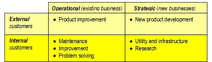 ….[Shenhar & Dvir] identified two dimensions to divide projects: the strategic goal dimension, which included operational and strategic projects, and the customer dimension, which involves external and internal customers … This results in four major groups of projects …
