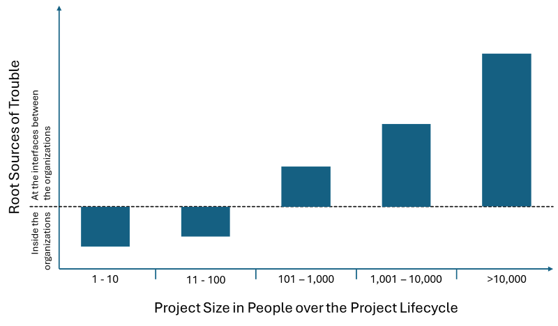 A comprehensive study with 346 survey participants uncovered a surprising revelation for Project Business[1]: In smaller cross-corporate projects, issues more frequently originate within the individual organizations involved. However, in larger projects, these problem areas shift to the interfaces between the organizations. This underscores the critical importance of effective communication, collaboration, and mutual respect among the involved organizations in these projects.