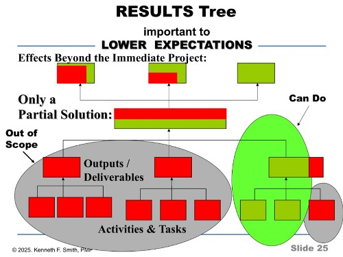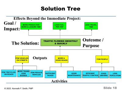 The classic Problem- Solution- Results Tree technique has been my go-to and mainstay over the past 30 years for conducting and supporting Pre-feasibility and Feasibility analysis during the Initiation Phase of the Project Management Process. In considering a potential project, the ‘cause-effect’ relationships of a situation are succinctly displayed metaphorically for varying conditions pertinent to each stage for rapid review, presentation to, and understanding by disparate audiences.