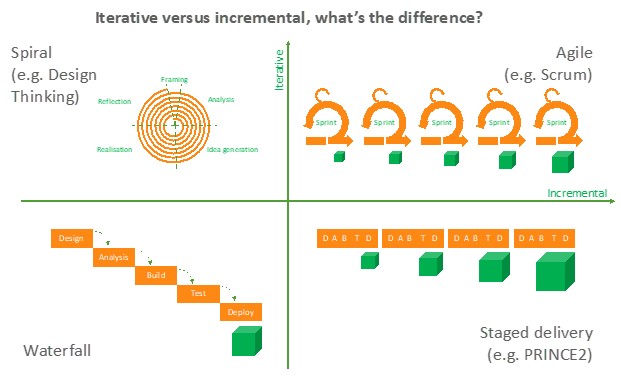 To make it visual, the figure above shows four quadrants representing four approaches. These are created by the two axes. The horizontal line represents the use or non-use of an incremental process. Then the vertical line represents whether or not to use an iterative process.