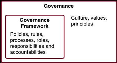 Governance can be formal and structured things such as policies, rules, processes, roles, responsibilities and accountabilities. This type of governance is usually formalized and documented and may be referred to as a governance framework. But governance can also include things that may be hard to formalize and document, such as culture, principles and values.
