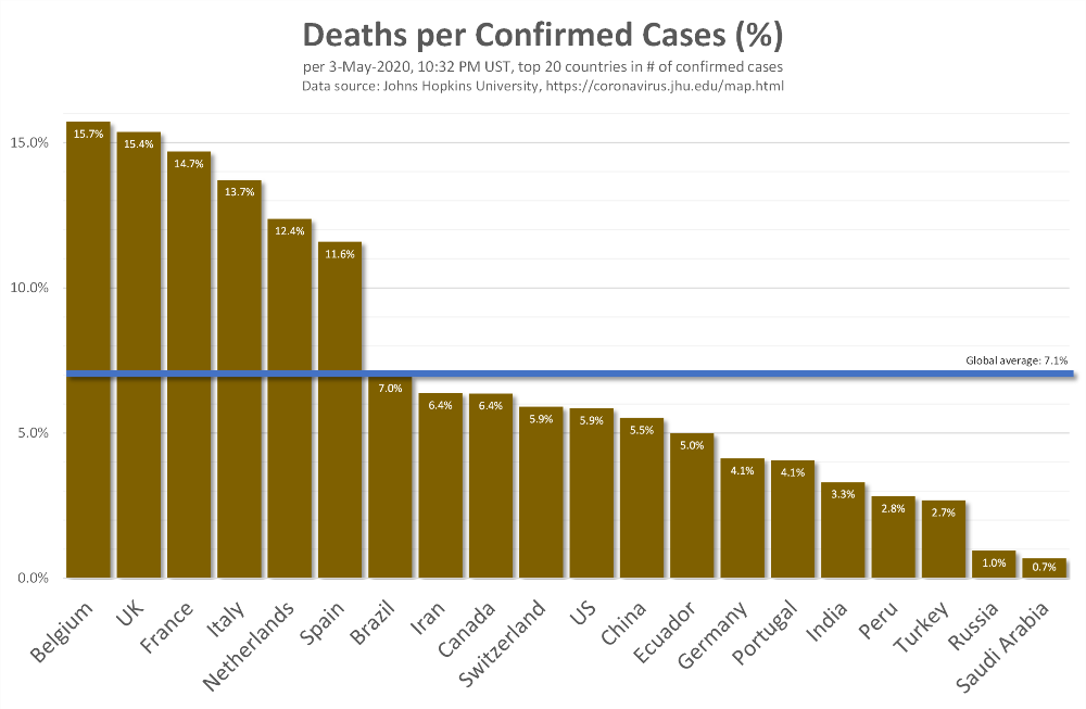 Figure 1: Deaths per confirmed cases of COVID-19 infections per 3-May-2020, 10:32 PM UST for the top 20 countries in # of confirmed cases. Data source: Johns Hopkins University[2]