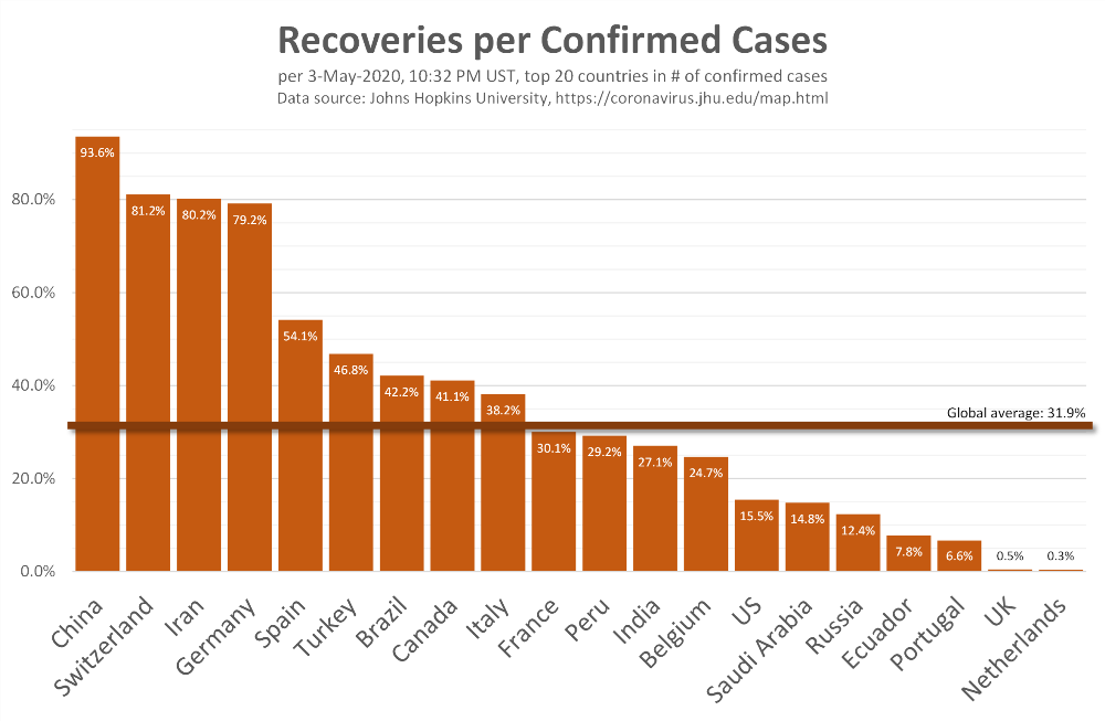 Figure 2: Recoveries per confirmed cases of COVID-19 infections per 3-May-2020, 10:32 PM UST for the top 20 countries in # of confirmed cases. Data source: Johns Hopkins University3